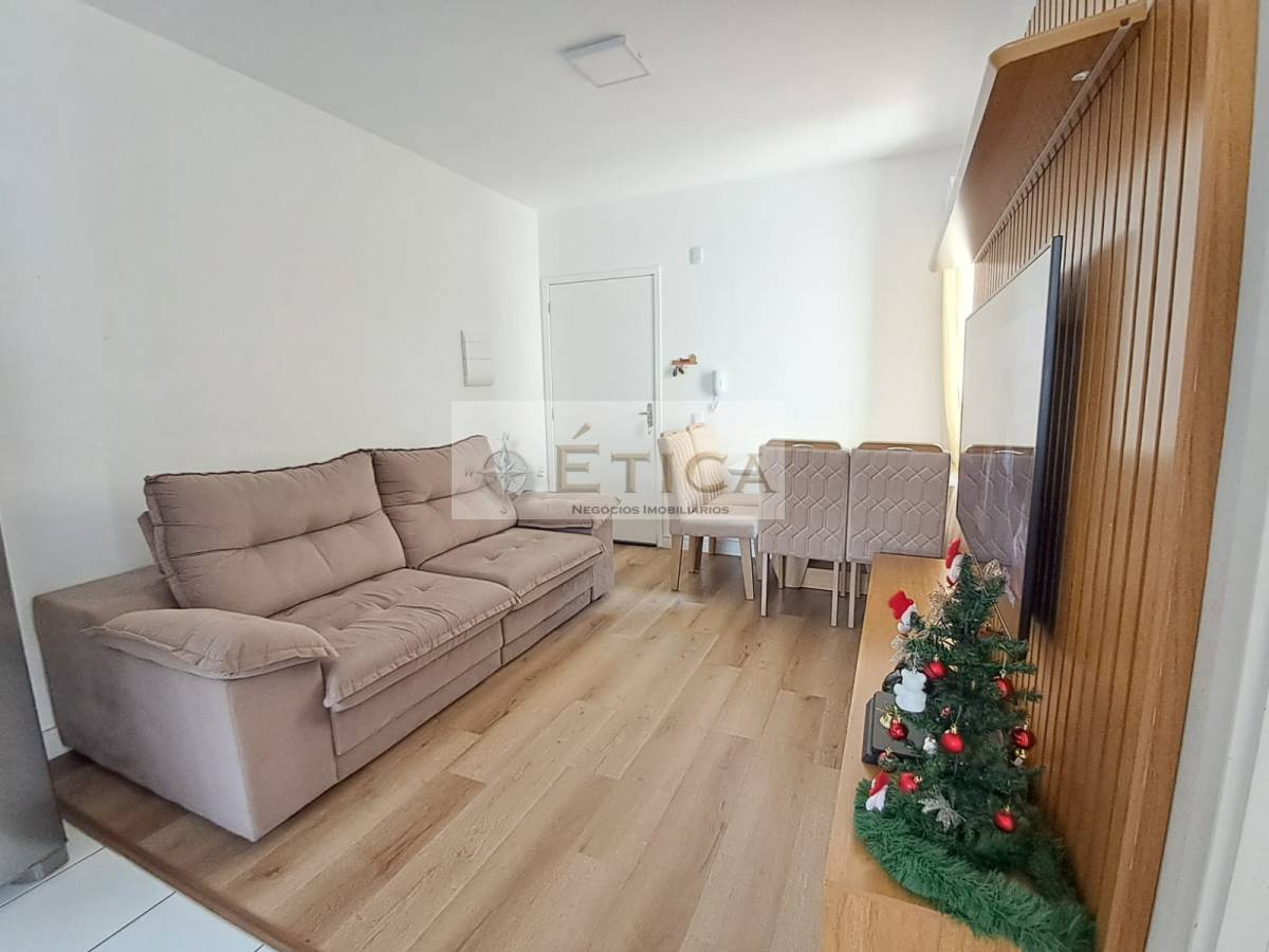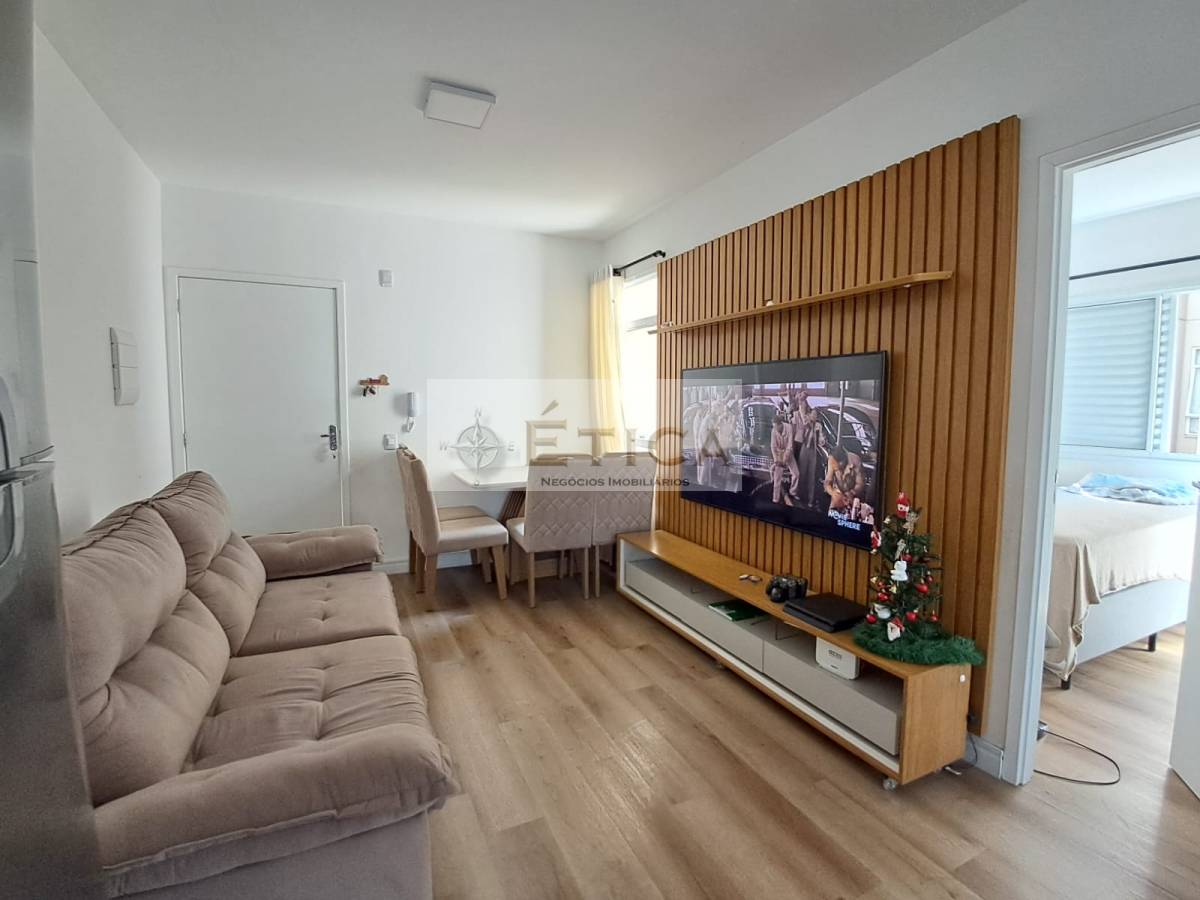 Apartamento com dois quartos, banheiro, cozinha e sala integrados, possui uma vaga de garagem.