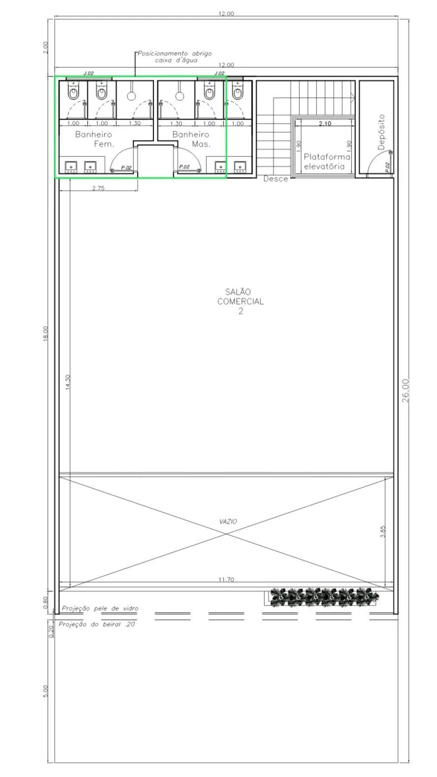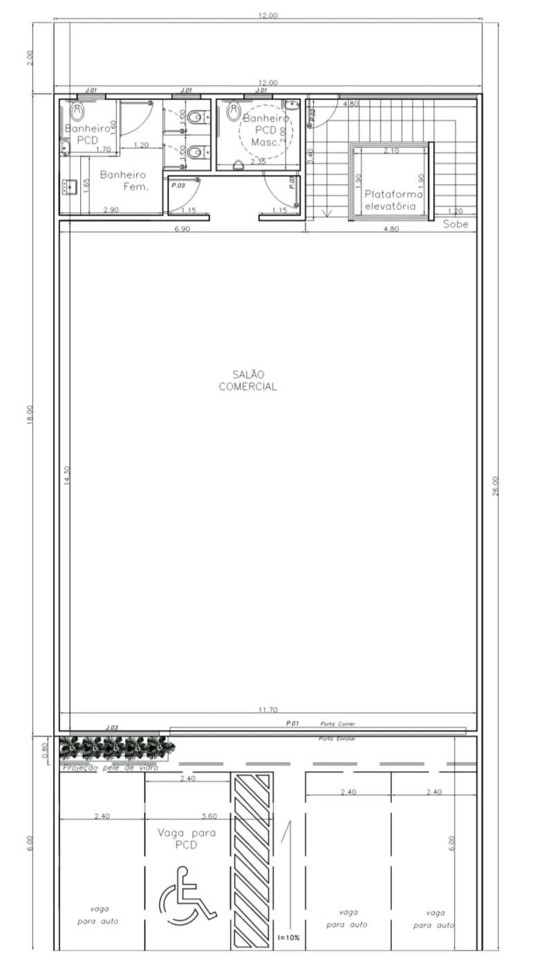 Salão Comercial 01 (Térreo): 11,70m x 14,30m de área livre
